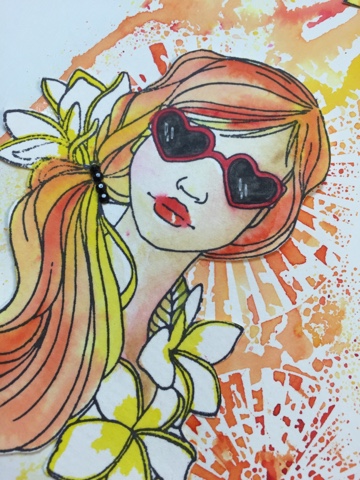 For my girl i stamped her on the Bloom Girls watercolor paper and decided to play with the sun on her back. I thought it would make a nice mosaic effect over the stencil.